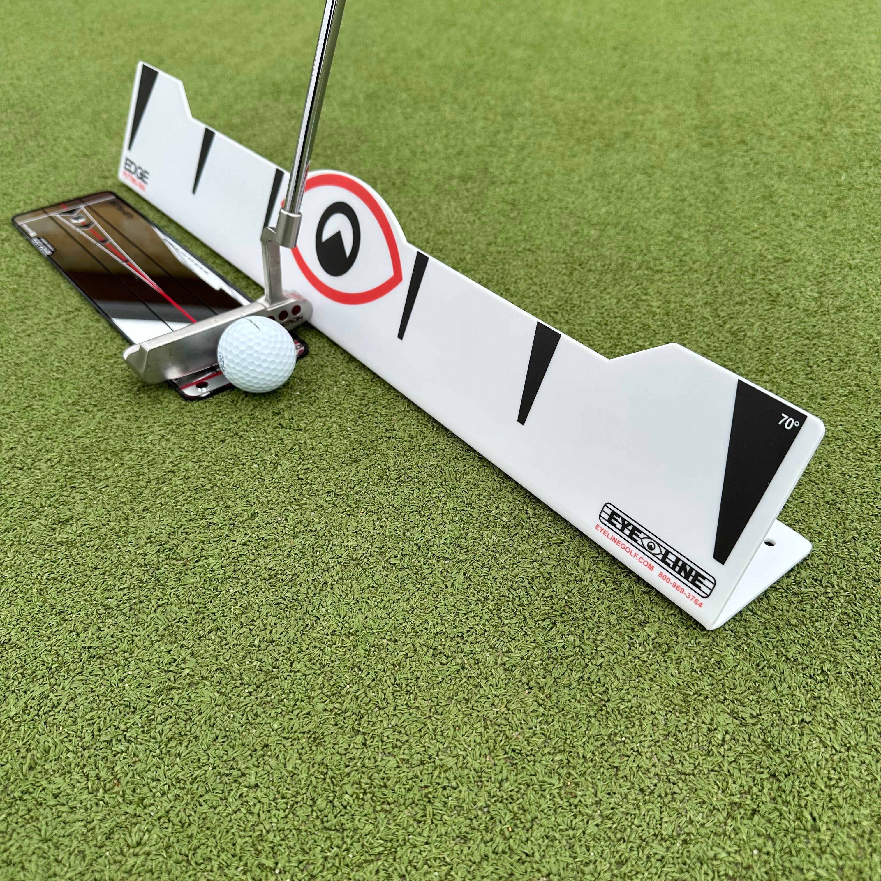 The Edge Rail is the perfect way to train an arcing stroke. The rail is set at 70˚ and this allows the putter to flow inside the line on the back and through strokes, while the putter face stays square to the plane (similar to your swing plane). Alternatively, when players try to train on a flat arc device or template, many end up manipulating their hand positions during the stroke to try and trace that path. The Edge Rail will feel more natural, as you rotate the putter around your spine.